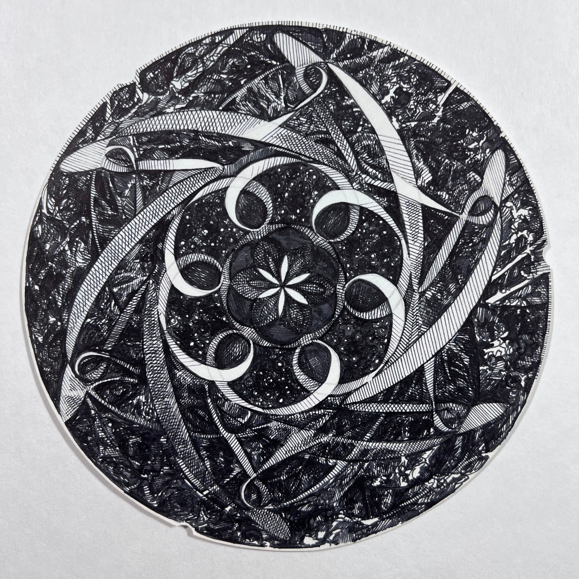 The Star Flower Spirograph Illustration is completed with ink pen and has a lovely play of depth. The ribbon dancing around the central star seems to dance into the background and foreground with a twirling movement. Subtle branches emerge from the background around the edges and stars highlight the central star flower and ribbon loops.